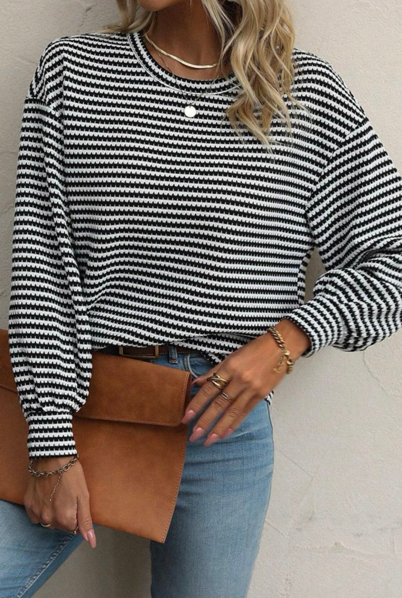 Black Stripe Round Neck Thin Stripe Long Sleeve Top