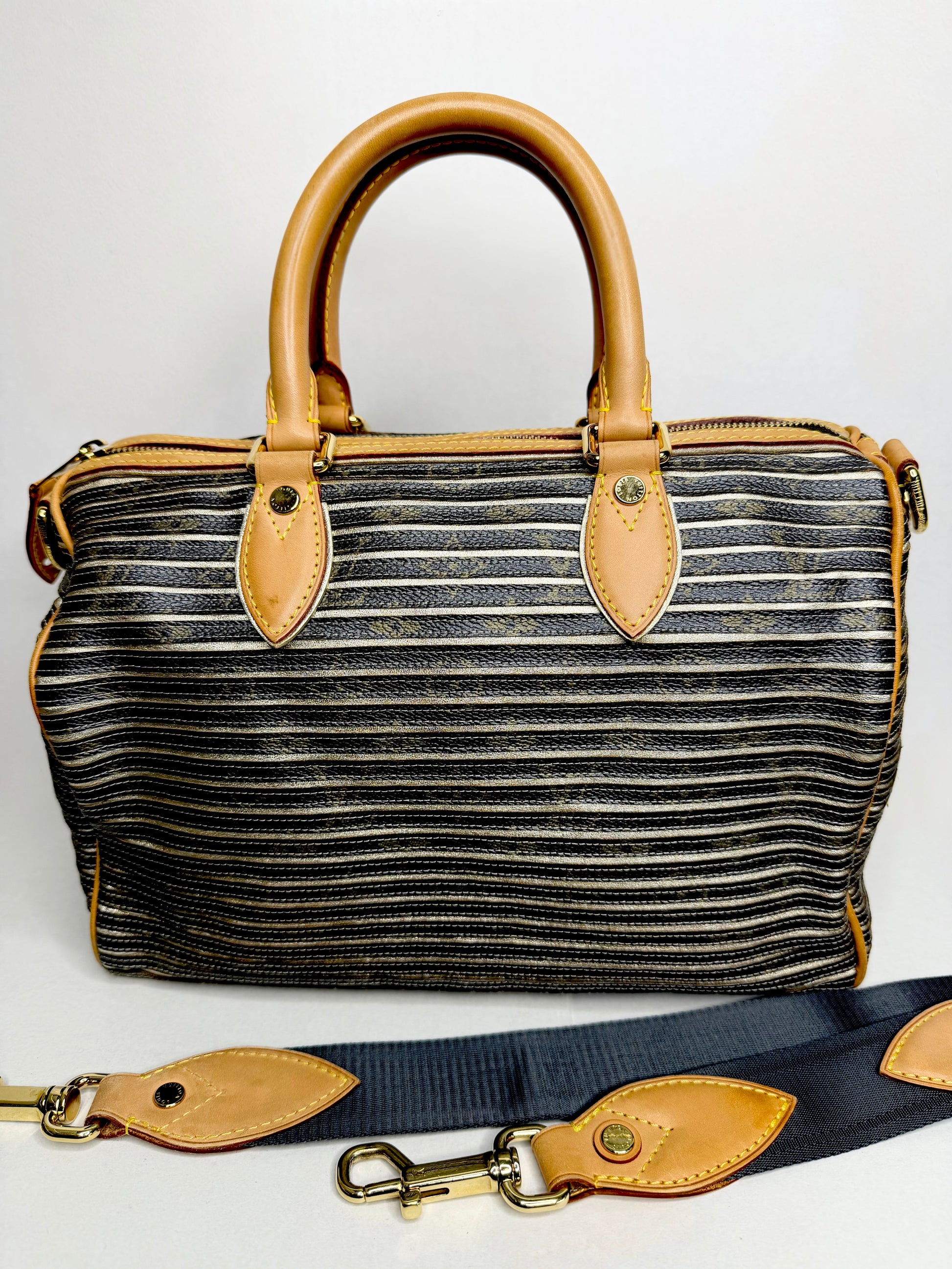 - Condition: Excellent clean canvas, leather looks incredible. Just one minor watermark on the exterior hardware looks great no creasing to the leather adjustable strap interior looks fantastic no odor or stains limited edition piece for 2010. Minor marks on hardware.